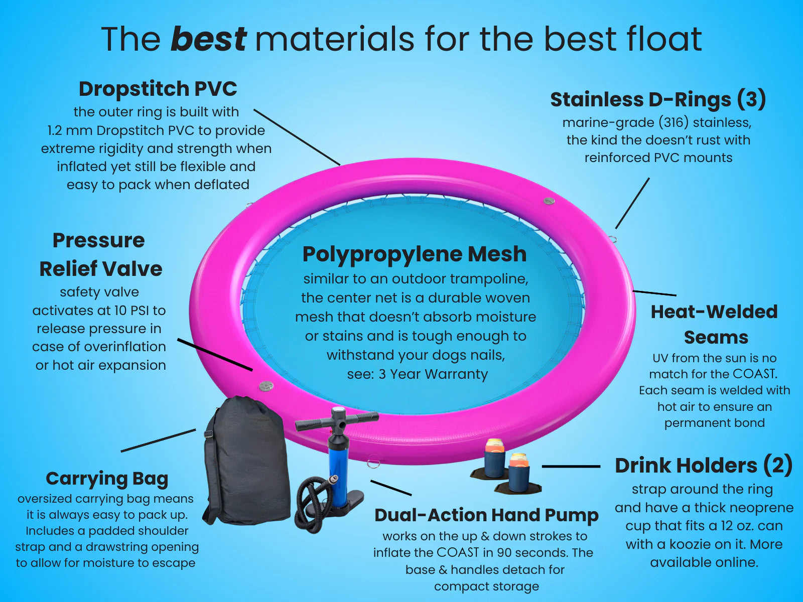 Only 18lbs, COAST FLOAT is simple to use and carry. Inflate in 90 seconds and get the party starting quickly.